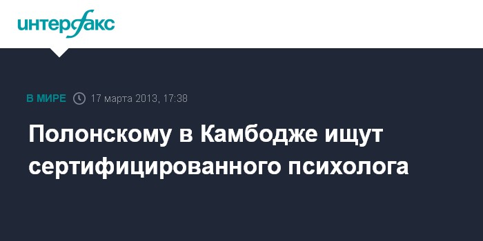 Пномпень. 17 марта. INTERFAX.RU - В российском посольстве знают о просьбе предпринимателя Сергея Полонского о предоставлении ему сертифицированного МИДом психолога, сообщил в воскресенье "Интерфаксу" врач посольства РФ в Камбодже Сергей Пономаренко. "Я в курсе этой ситуации. Я разговаривал с ним позавчера. Это крайне тяжело (найти сертифицированного психолога) сделать за границей. Это очень затруднительно, да еще для человека, который находится в тюрьме. Это надо часами сидеть с ним. Но по мере своей возможности стараюсь. Это огромная проблема", - сказал С.Пономаренко.