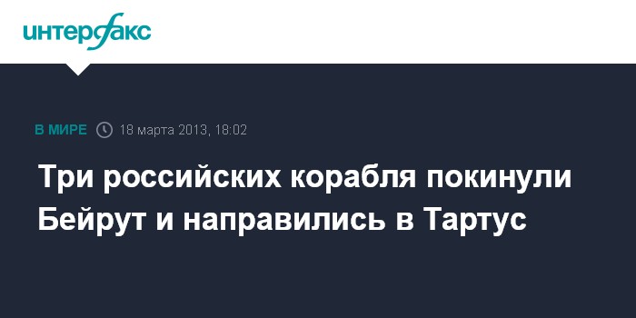 Ранее официальный представитель ВМФ России сообщил "Интерфаксу-АВН", что 14 марта российские корабли зашли на два дня с деловым визитом в порт столицы Ливана Бейрут. "Цель захода сторожевого корабля "Ярослав Мудрый" и больших десантных кораблей "Калининград" и "Александр Шабалин" - пополнение запасов и отдых экипажей", - пояснил он.