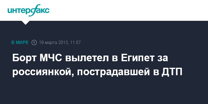 Москва. 19 марта. INTERFAX.RU - Самолет Ил-76 МЧС России вылетел в Арабскую Республику Египет для транспортировки российской туристки, серьезно пострадавшей в ДТП, сообщается на сайте МЧС во вторник.