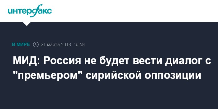 Москва. 21 марта. INTERFAX.RU- Россия не будет вести диалог с избранным внешней сирийской оппозицией премьером оппозиционного правительства этой страны Хасаном Хитто, заявил официальный представитель МИД России Александр Лукашевич.
