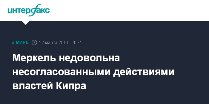 Берлин. 22 марта. INTERFAX.RU - Канцлер Германии Ангела Меркель выразила недовольство тем, что правительство Кипра не согласовывало с "тройкой" международных кредиторов план спасения финансовой системы страны, который в пятницу обсуждается в кипрском парламенте, сообщило агентство Bloomberg со ссылкой на информированные источники.
