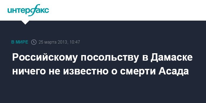 Москва. 25 марта. INTERFAX.RU - Посольство РФ в Дамаске не располагает информацией о смерти президента Сирии Башара Асада. "Нам об этом ничего не известно, но, насколько я знаю, в ряде арабоязычных СМИ уже появились опровержения", - заявили "Интерфаксу" в российской дипмиссии.