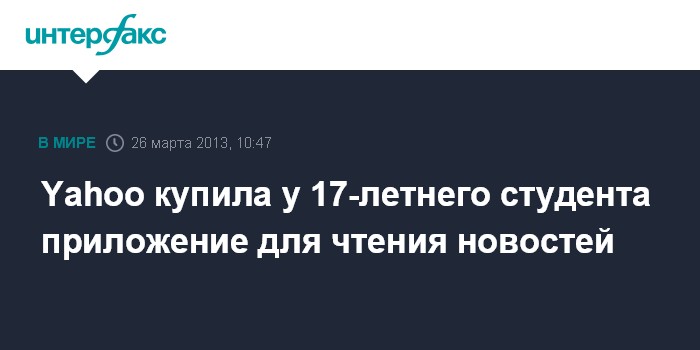 Нью-Йорк. 26 марта. INTERFAX.RU - Интернет-компания Yahoo! владелец самого посещаемого веб-портала в США, купила у 17-летнего студента Ника Д'Алозио приложение Summly для чтения новостей.