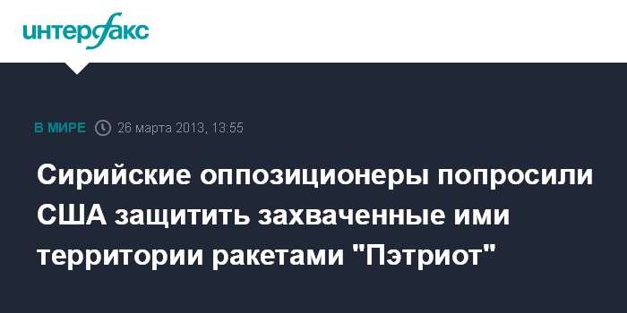 Дубай. 26 марта. INTERFAX.RU - Лидер сирийской оппозиционной коалиции Моаз аль-Хатыб сообщил, что на недавней встрече с госсекретарем США Джоном Керри попросил его защитить север Сирии ракетами "Пэтриот".