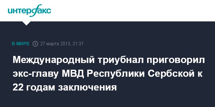 Белград. 27 марта. INTERFAX.RU - Международный уголовный трибунал по бывшей Югославии (МТБЮ) в среду приговорил экс-министра внутренних дел Мичо Станишича и экс-главу полиции Республики Сербской (в составе Боснии и Герцеговины) Стояна Жуплянина к 22 годам тюремного заключения, сообщает телерадиокомпания республики Сербской.