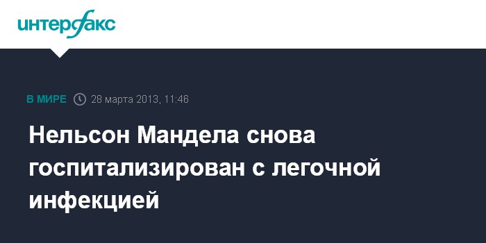 Йоханнесбург. 28 марта. INTERFAX.RU - Бывший президент ЮАР Нельсон Мандела был госпитализирован в среду с повторным обострением легочной инфекции, сообщили в четверг в администрации нынешнего главы государства Джейкоба Зумы.