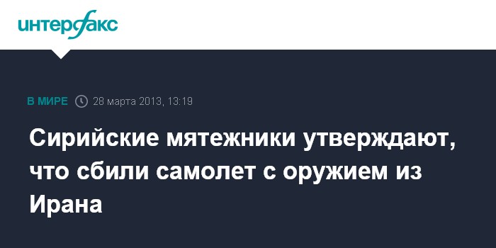 Дубай. 28 марта. INTERFAX.RU - Сирийские активисты утверждают, что бойцы оппозиционной Свободной сирийской армии (ССА) сбили самолет из Ирана с грузом вооружений для армии, сообщает в четверг межарабский телеканал Al Jzazeera.