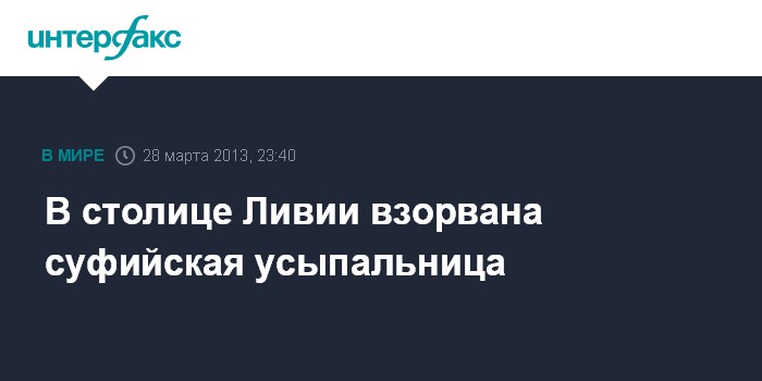 Дубай. 28 марта. INTERFAX.RU - Неизвестные злоумышленники в Триполи взорвали усыпальницу XV века, в которой был погребен духовный лидер суфиев Сиди аль-Андлузи, сообщили в четверг межарабский телеканал "Аль-Джазира".