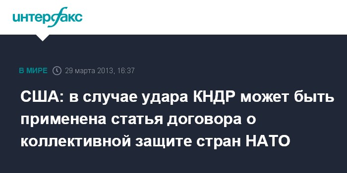 Москва. 29 марта. INTERFAX.RU - Атака на военные объекты США со стороны КНДР гипотетически может повлечь за собой применение 5-й статьи Вашингтонского договора, предусматривающей коллективную защиту территории страны-члена НАТО, заявил заместитель генсека НАТО Александр Вершбоу.