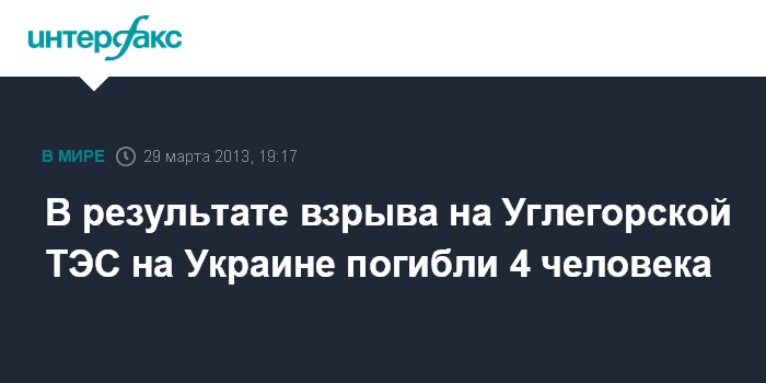 Киев. 29 марта. INTERFAX.RU - В результате взрыва на Углегорской ТЭС (Светлодарск Донецкая обл.) произошел взрыв, в результате которого полностью сгорели четыре блока станции, погибли 4 чел., сообщается на официальном сайте ежедневной газеты "Сегодня".