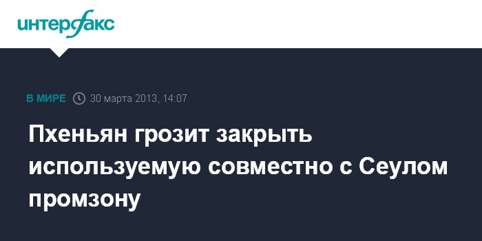 Сеул. 30 марта. INTERFAX.RU - Власти КНДР грозят закрыть используемую совместно с Южной Кореей промышленную зону Кэсон в случае, если Сеул продолжит провокации, говорится в сообщении ЦТАК, выпущенном в субботу.