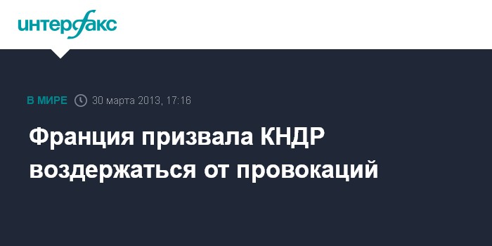 Париж. 30 марта. INTERFAX.RU - Франция обеспокоена ростом напряженности на Корейском полуострове и призывает КНДР воздержаться от провокаций, сообщили в пресс-службе французского МИД. "Париж призывает Северную Корею воздержаться от каких-либо провокаций и следовать своим обязательствам перед международным сообществом - в рамках соответствующих резолюций ООН - и вернуться на тропу диалога", - говорится в коммюнике французского дипломатического ведомства.