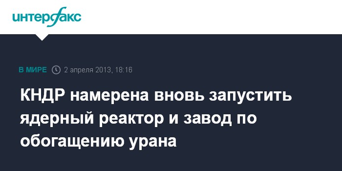 Сеул. 2 апреля. INTERFAX.RU - Главное управление ядерной энергетики КНДР во вторник объявило о намерении возобновить работы всех ядерных объектов в Йонбене, включая ядерный реактор и завод по обогащению урана.