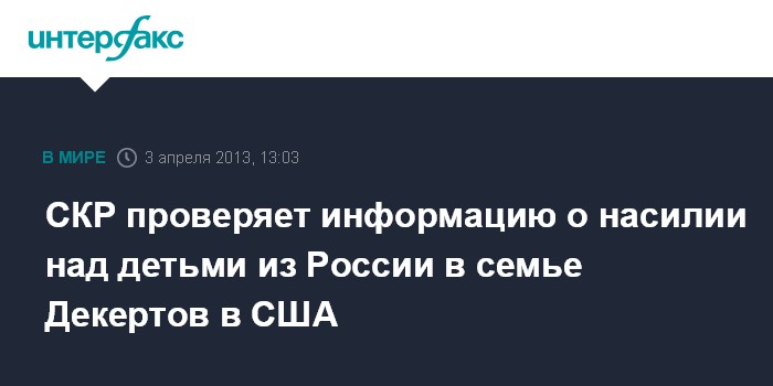 Москва. 3 апреля. INTERFAX.RU - Следственный комитет РФ начал процессуальную проверку в связи с сообщениями о насилии в отношении усыновленных в РФ детей гражданами США - супругами Майклом и Пенни Декерт, сообщил "Интерфаксу" официальный представитель Следственного комитета Владимир Маркин.