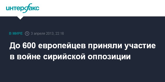 Лондон. 3 апреля. INTERFAX.RU - От 140 до 600 добровольцев из Европы приняли участие с 2011 г. в вооруженной борьбе сирийских оппозиционеров против правительственных войск, говорится в докладе Международного центра по изучению радикальных движений при лондонском Кингс-колледже.