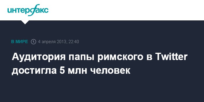 Рим. 4 апреля. INTERFAX.RU - Число пользователей, подписавшихся на страницу папы римского Франциска в сети Twitter, удвоилось с 2,5 млн до 5 млн человек за последние семь недель, сообщают итальянские СМИ.