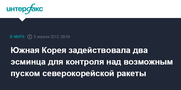 Сеул. 5 апреля. INTERFAX.RU - Южнокорейские власти направили в районы своего восточного и западного побережья два эсминца, оснащенных современными радарными системами, для контроля над возможным пуском северокорейской ракеты, сообщили местные СМИ в пятницу.