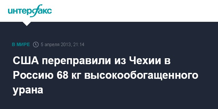 Вашингтон. 5 апреля. INTERFAX.RU - Специалисты США в сотрудничестве с Россией, Чехией и МАГАТЭ осуществили транспортировку 68 кг высокообогащенного урана из Чехии в Россию, заявила в пятницу пресс-секретарь Совета национальной безопасности США Кэтлин Хайден.