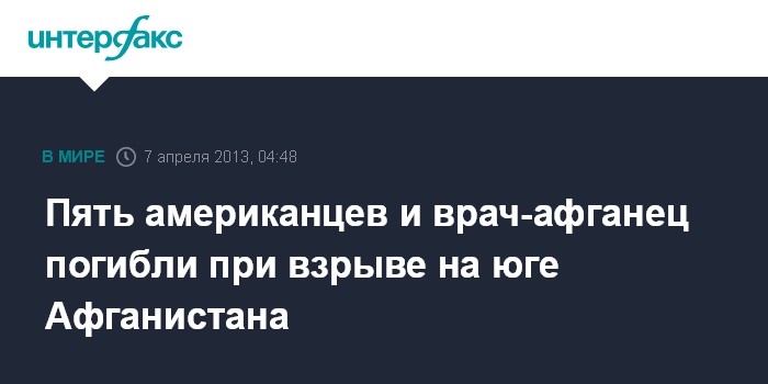 Лондон. 7 апреля. ИНТЕРФАКС - На юге Афганистана в провинции Забул при взрыве заминированного автомобиля погибли пять американцев и один врач-афганец, сообщает британская телерадиовещательная корпорация Би-би-си со ссылкой на госсекретаря США Джона Керри.