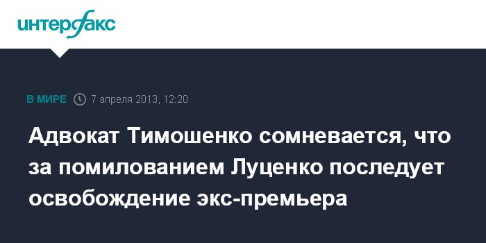 Киев. 7 апреля. INTERFAX.RU - Адвокат экс-премьера Юлии Тимошенко Александр Плахотнюк выразил сомнения в том, что вслед за помилованием экс-министра МВД Юрия Луценко будет освобождена и экс-премьер.