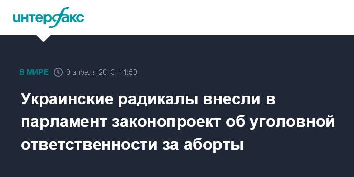 Киев. 8 апреля. INTERFAX.RU - Народные депутаты фракции "Свобода" предлагают запретить искусственное прерывание беременности на Украине, а за проведение абортов, кроме случаев, предусмотренных законодательством, ввести уголовную ответственность.