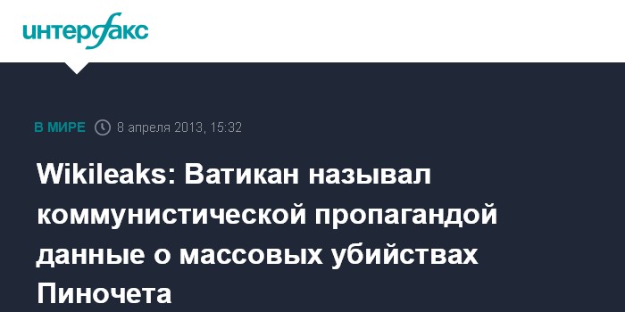 Вашингтон. 8 апреля. INTERFАX.RU - Ватикан в 1973 году опровергал информацию о массовых убийствах, осуществляемых по приказу чилийского диктатора Аугусто Пиночета, говорится в материалах, обнародованных в понедельник на сайте Wikileaks.
