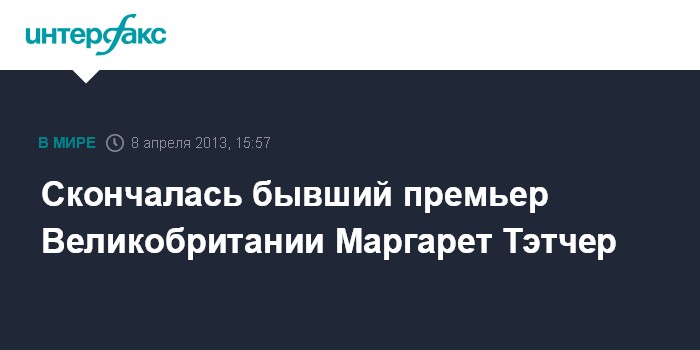 Лондон. 8 апреля. INTERFAX.RU - Бывший премьер-министр Великобритании Маргарет Тэтчер скончалась в возрасте 87 лет, сообщил в понедельник телеканал Sky News.
