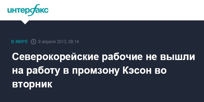 Сеул. 9 апреля. INTERFAX.RU - Работающие в совместной с Южной Кореей промышленной зоне Кэсон на территории КНДР северокорейские рабочие не вышли на работу во вторник, сообщили южнокорейские СМИ.