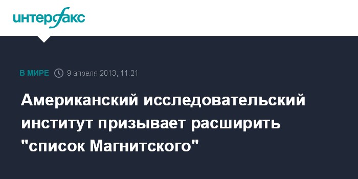Вашингтон. 9 апреля. INTERFAX.RU - Стратегический исследовательский институт США фонд "Хэритэдж" призвал госдепартамент принять расширенный вариант "списка Магнитского".