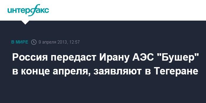 Тегеран. 9 апреля. INTERFAX.RU - Сдача в эксплуатацию АЭС "Бушер" российской стороной произойдет в конце апреля, заявил во вторник глава Организации по атомной энергии Ирана Ферейдун Аббаси.