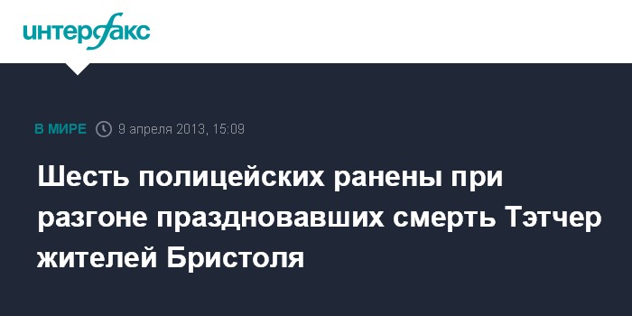 Лондон. 9 апреля. INTERFAX.RU - Шестеро сотрудников полиции получили ранения при разгоне порядка 200 демонстрантов в городе Бристоле, праздновавших смерть экс-премьера Великобритании Маргарет Тэтчер, сообщила во вторник британская газета The Daily Telegraph.