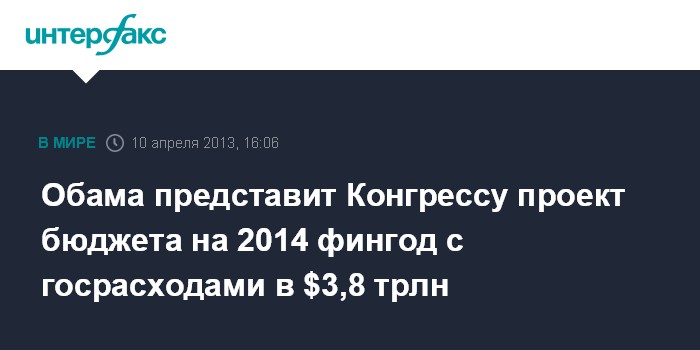 Вашингтон. 10 апреля. INTERFAX.RU - Президент США Барак Обама в среду направит в Конгресс проект бюджета на 2014 финансовый год (1 октября 2013 г. - 30 сентября 2014 г.), призванный ослабить напряженность в рамках обсуждения вопроса о лимите госдолга и сокращении бюджетного дефицита, заявили журналистам в среду представители Белого дома.