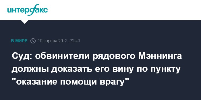 Вашингтон. 10 апреля. INTERFAX.RU - Военный судья, рассматривающий дело сотрудничавшего с порталом Wikileaks рядового армии США Брэдли Мэннинга, заявил, что правительство страны должно представить доказательство его вины по пункту "оказание помощи врагу", сообщает в среду американский информационный веб-сайт Huffington Post.