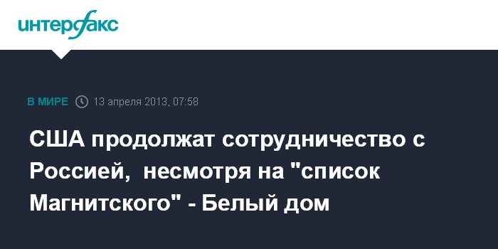 Вашингтон. 13 апреля. ИНТЕРФАКС - Соединенные Штаты намерены продолжать сотрудничать с Россией по ряду ключевых вопросов, несмотря на "список Магнитского".