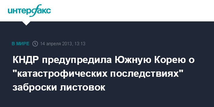 Сеул. 14 апреля. INTERFAX.RU - Пхеньян предупредил Южную Корею о том, что она столкнется с катастрофическими последствиями, если власти позволят в национальный праздник КНДР "День солнца" южнокорейским неправительственным организациям (НПО) направить пропагандистские листовки на север полуострова.
