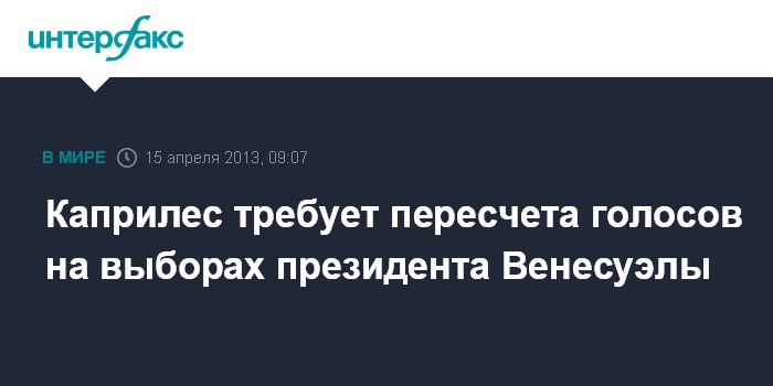 Каракас. 15 апреля. INTERFAX.RU - Лидер венесуэльской оппозиции Энрике Каприлес заявил в понедельник, что не признает результаты президентских выборов до тех пор, пока не будет произведен пересчет голосов, сообщает агентство АП.