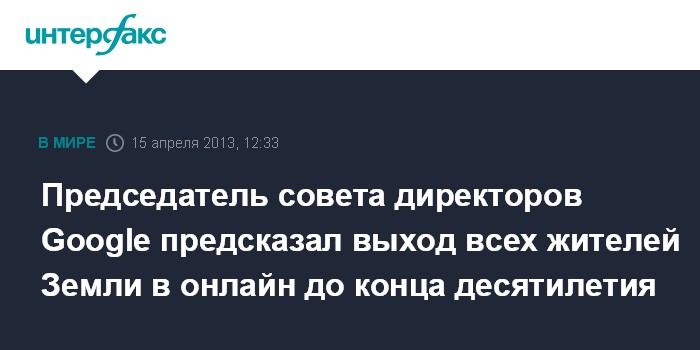 Москва. 15 апреля. INTERFAX.RU - Глава совета директоров американского интернет-гиганта Google Эрик Шмидт полагает, что до конца этого десятилетия выход в Интернет получат все жители Земли.
