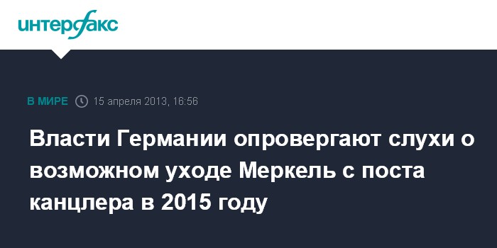 Берлин. 15 апреля. INTERFAX.RU - Правительство ФРГ не согласилось с прогнозами газеты "Бильд" о возможном уходе Меркель в отставку в 2015 году, сообщают в понедельник местные СМИ.