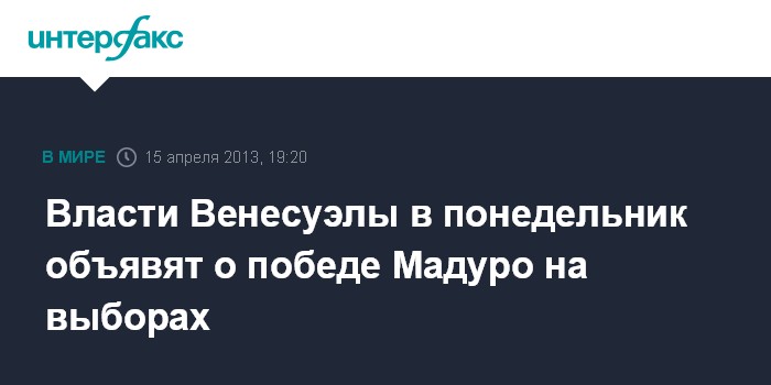 Каракас. 15 апреля. INTERFAX.RU - Набравший большинство голосов на президентских выборах Николас Мадуро в понедельник будет официально объявлен президентом, сообщает местный телеканал "Глобовисьон".