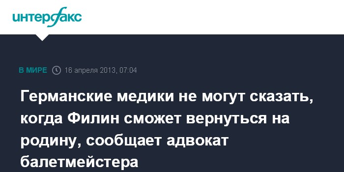 Москва. 16 апреля. ИНТЕРФАКС - Немецкие врачи пока не делают предположений о том, когда в Россию сможет вернуться художественный руководитель балетной труппы Большого театра Сергей Филин, подвергшийся нападению.
