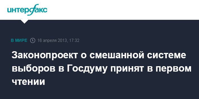 Москва. 16 апреля. INTERFAX.RU - Госдума во вторник приняла в первом чтении президентский законопроект "О выборах депутатов Государственной Думы Федерального Собрания РФ", возвращающий смешанную систему избрания в нижнюю палату парламента (за - 296, при необходимом минимуме в 226 голосов, против - 148, один воздержался).