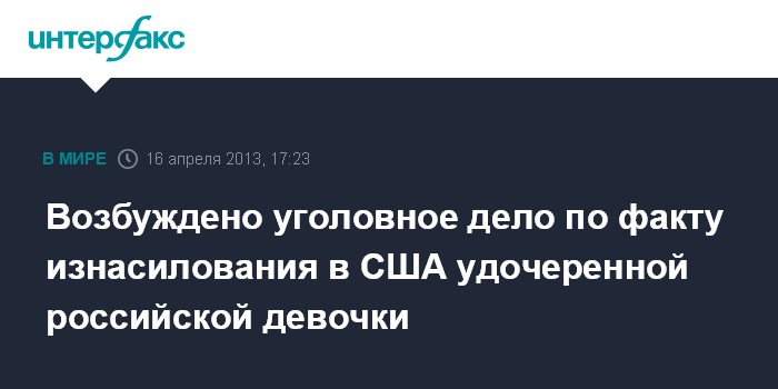Москва. 16 апреля. INTERFAX.RU - Следственный комитет России возбудил уголовное дело по факту насильственных действий сексуального характера в США в отношении удочеренной в 2002 году в России девочки.