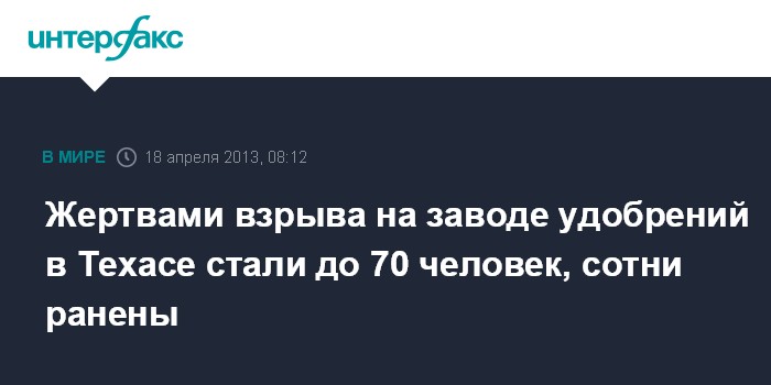 Уэйко. 18 апреля. INTERFAX.RU - В результате взрыва, произошедшего на заводе по производству удобрений вблизи города Уэйко (штат Техас), погибли от 60 до 70 человек, сотни получили ранения, сообщает телеканал KWTX со ссылкой на главу экстренных служб западного побережья США Джоржа Смита.