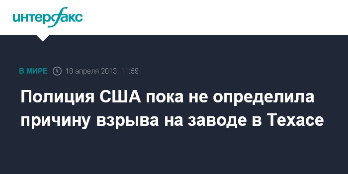 Вашингтон. 18 апреля. INTERFAX.RU - Полицейские пока не смогли определить причину взрыва на заводе удобрений в американском городе Уэст (штат Техас), заявил местных журналистам представитель полиции.