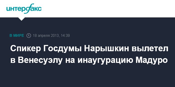 Москва. 18 апреля. INTERFAX.RU - Председатель Государственной Думы Сергей Нарышкин, который будет представлять Россию на торжествах по случаю вступления в должность вновь избранного президента Боливарианской Республики Венесуэла Николаса Мадуро, вылетел в четверг из Москвы в Каракас.