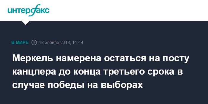 Берлин. 18 апреля. INTERFAX.RU - Канцлер ФРГ Ангела Меркель не собирается покидать пост канцлера в середине третьего срока в случае победы на сентябрьских выборах.
