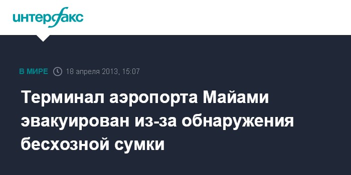 Вашингтон. 18 апреля. INTERFAX.RU - В одном из терминалов международного аэропорта Майами в четверг прошла эвакуация людей в связи с обнаружением подозрительной сумки, сообщил американский телеканал NBC.