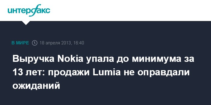 Эспоо. 18 апреля. INTERFAX.RU - Выручка Nokia Oyj по итогам первого квартала 2013 г. упала на 20% - до 5,85 млрд евро, минимума за последние 13 лет. Как сообщила компания, убытки связаны с сокращением спроса на мобильные телефоны.