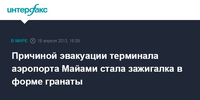 Вашингтон. 18 апреля. INTERFAX.RU - Зажигалка в форме гранаты послужила причиной эвакуации одного из терминалов международного аэропорта Майами в четверг, сообщил местный телеканал "Эн-би-си Майами" со ссылкой на руководство аэропорта.