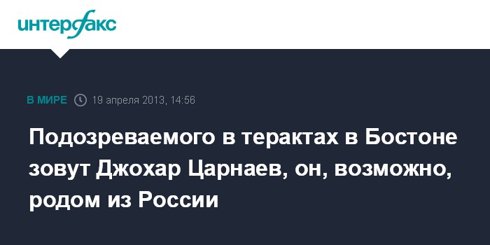 "Подозреваемые в теракте в Бостоне родом из российского региона, расположенного рядом с Чечней, они жили в США как минимум на протяжении года", - говорится в сообщении. В то же время некоторые американские СМИ полагают, что оба подозреваемых - чеченцы.